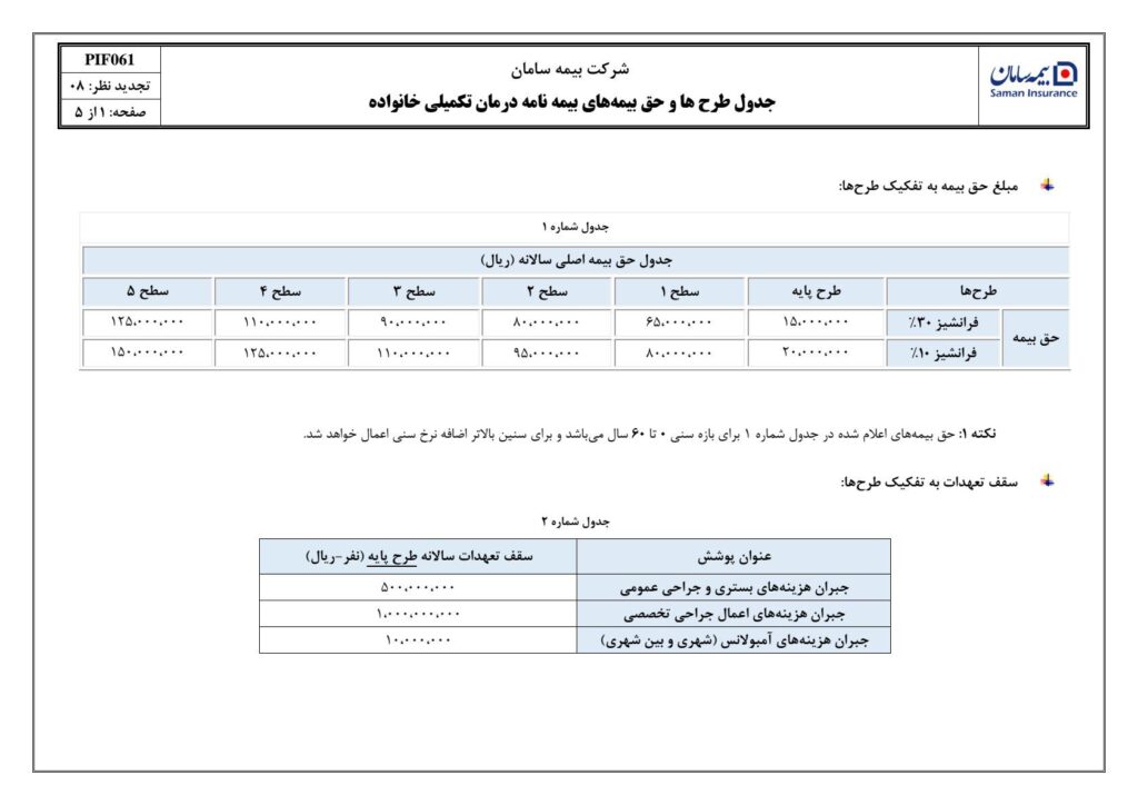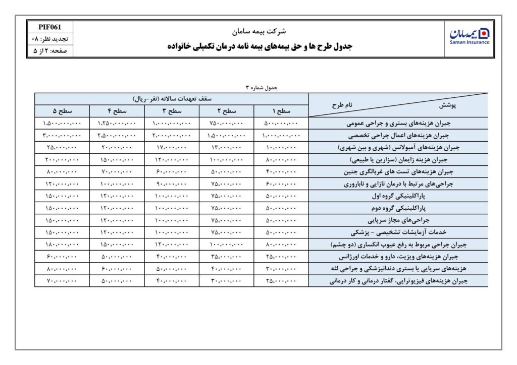 شرکت بیمه سامان برای بیمه های انفرادی خود 5 سطح متفاوت دارد و بیمه گذاران می توانند براساس نیاز خود هر کدام از سطحها را انتخاب نمایند . در این میان سطح 1 ارزانترین و سطح 5 کامل ترین پوششها را داراست . انواع طرحها و تعهدات را می توانید در جدول زیر مشاهده فرمایید.